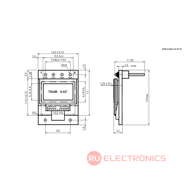 Ультракомпактный 0.42" OLED-модуль на контроллере SSD1306 (белое свечение) с разрешением 72x40 точек. Интерфейс I2C, 4 вывода: GND, VCC, SCL, SDA; питание 3.3 В, шаг контактов 2.54 мм. Габариты 12x17 мм, область отображения 9.196 5.18 мм, высокая контрастность, низкое энергопотребление и широкий угол обзора. Идеален для мини-устройств, носимой электроники, IoT и DIY-проектов; рабочая температура -40…+70 °C.