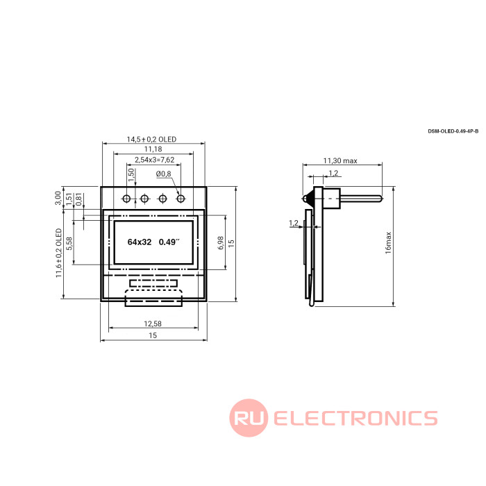 Компактный 0.49" OLED-модуль RUICHI DSM-OLED-0.49-4P-B на контроллере SD1315 с разрешением 64x32 точек и белым свечением. Интерфейс I2C (4 вывода: GND, VDD, SCK, SDA), питание 3–5 В. Видимая область 12.58x6.98 мм, активная 11.18x5.58 мм, габариты 15x15x11.3 мм. Высокая контрастность, низкое энергопотребление и широкий температурный диапазон -40…+85 °C делают дисплей отличным выбором для мини-устройств, носимой электроники, IoT и DIY-проектов.