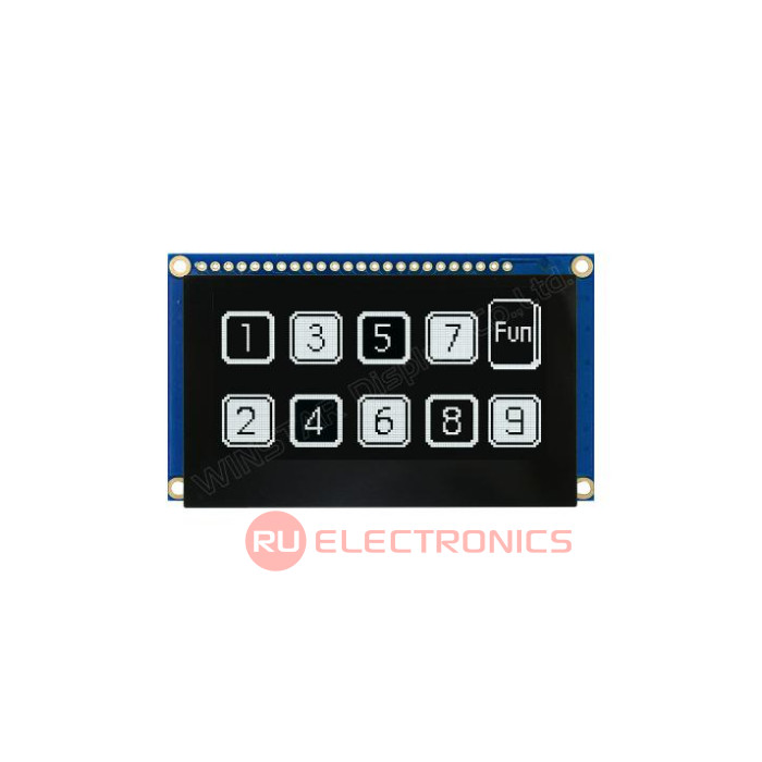 WEP012864QLPP3D00000 – это 2.7" дюймовый графический OLED дисплей с платой, с емкостной сенсорной тач панелью и крепёжной рамкой. Разрешение данного индикатора составляет 128x64 точки и сделан на базе контроллера IC SSD1309 c поддержкой интерфейсов: параллельного 6800/8080 8-Бит, I2C и четырехжильного SPI интерфейса. Напряжение питания модуля 3.3 В (типичное значение 3 В), а рабочий цикл 1/64; значение тока при засвете 50% площади индикатора составляет 175 мА при 3 В (типичное значение). Встроенный контроллер IC емкостной сенсорной панели – GT911 с поддержкой I2C интерфейса. Распознавание касания 1 пальца, без поддержки мультитач. Дисплей имеет глянцевое покрытие.