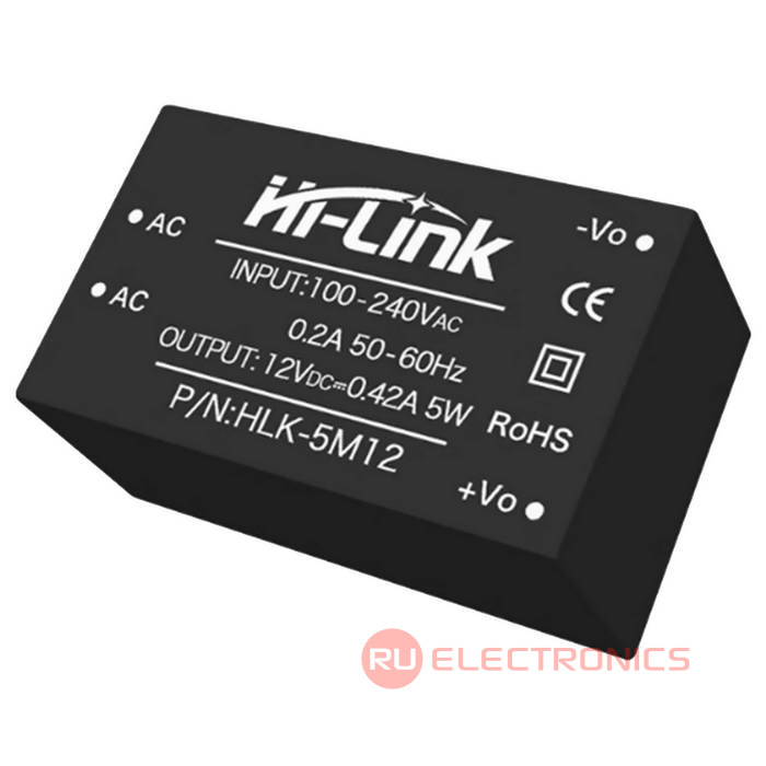 Блок питания на печатную плату Hi-Link HLK-5M12, 85-264 В (АС) 0.45 А, 12 В, корпус изьполикарбоната представляет собой преобразователь из напряжения переменного тока (AC) в напряжение постоянного тока (DC) малой мощности модульного типа. Отличительными особенностями импульсных блоков питания на печатную плату являются малогабаритный корпус, высокая плотность энергии (на объем модуля), и широкий диапазон рабочей температуры - от -25 до +60 °С.