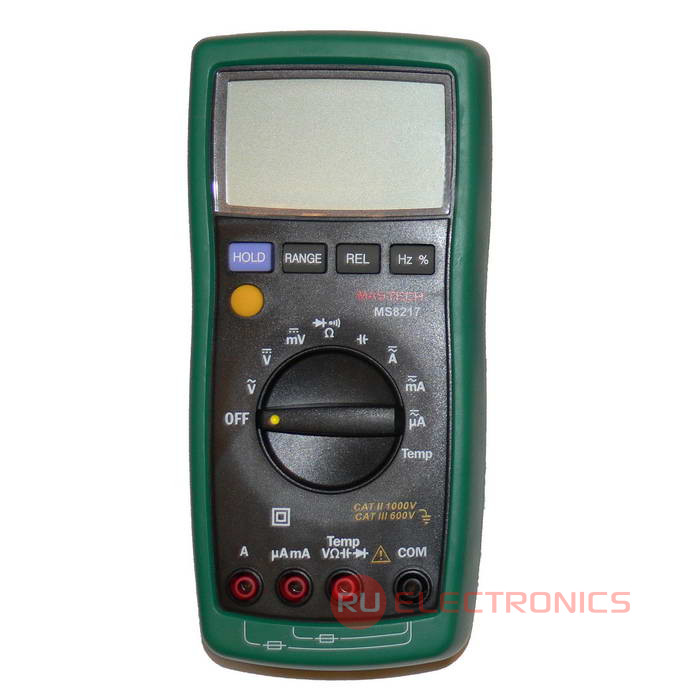 | Дополнительно | прозвонка цепи (R<75 Ом); диодный тест; ф-ция относ. измерений; "HOLD"; бат. тест 1,5 и 9 В |