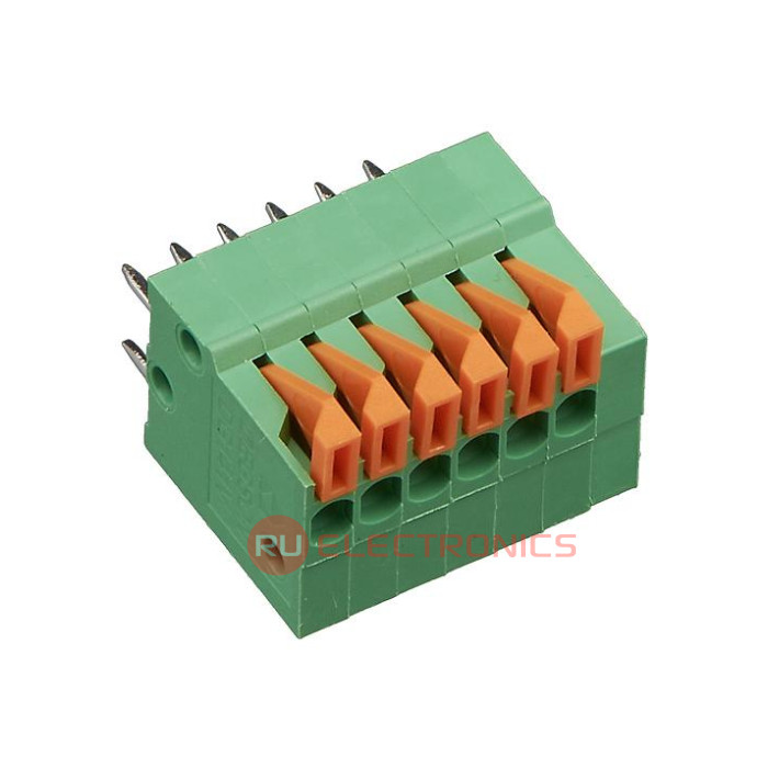 Шаг между контактами 2.54 мм, Тип разъема Клеммник на плату , Количество контактов 6 , Рабочий ток контактов 2 А, Рабочее напряжение между контактами 150 В, Сечение присоединяемых проводов, min 0.2 мм², Сечение присоединяемых проводов, max 1 мм², Способ фиксации провода Пружина , Цвет корпуса Зеленый , Конструктивное исполнение Прямой , Направление ввода к плате 90°