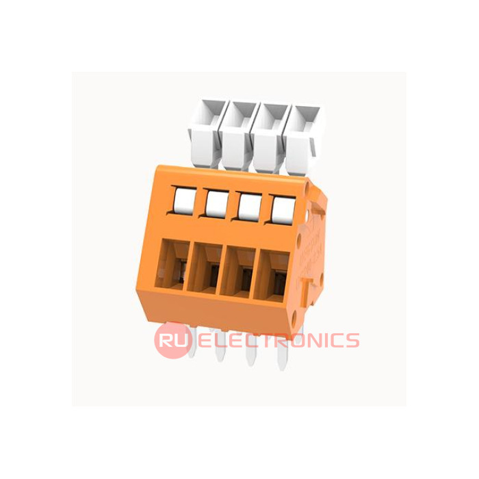 Шаг между контактами 2.54 мм, Тип разъема Клеммник на плату , Количество контактов 4 , Рабочий ток контактов 4 А, Рабочее напряжение между контактами 150 В, Сечение присоединяемых проводов, min 0.2 мм², Сечение присоединяемых проводов, max 0.5 мм², Способ фиксации провода Пружина , Цвет корпуса Оранжевый , Конструктивное исполнение Угловой , Направление ввода к плате 45°