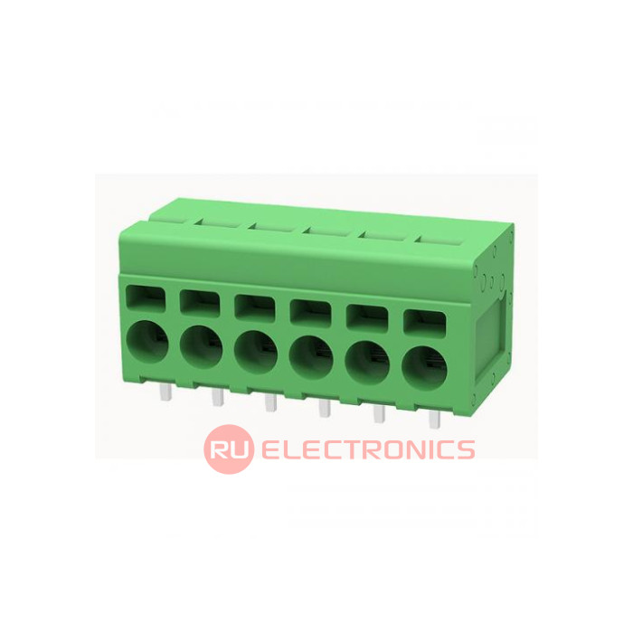 Шаг между контактами 5 мм, Тип разъема Нажимной клеммник , Количество контактов 6 , Рабочий ток контактов 20 А, Рабочее напряжение между контактами 300 В, Сечение присоединяемых проводов, min 0.2 мм², Сечение присоединяемых проводов, max 4 мм², Способ фиксации провода Пружина , Цвет корпуса Зеленый , Конструктивное исполнение Угловой , Направление ввода к плате 180°