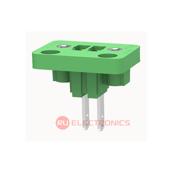 Шаг между контактами 3.81 мм, Тип разъема Клеммник врезной , Количество контактов 2 , Рабочий ток контактов 8 А, Рабочее напряжение между контактами 300 В, Сечение присоединяемых проводов, max 1.5 мм², Способ фиксации провода нет , Цвет корпуса Зеленый , Конструктивное исполнение Прямой , Направление ввода к плате 90° , Примечания В панель, с фиксирующими винтами