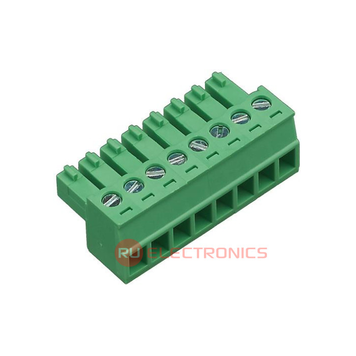 Шаг между контактами 3.81 мм, Тип разъема Клеммник на провод , Количество контактов 8 , Рабочий ток контактов 8 А, Рабочее напряжение между контактами 300 В, Сечение присоединяемых проводов, min 0.5 мм², Сечение присоединяемых проводов, max 1.5 мм², Способ фиксации провода Винт , Цвет корпуса Зеленый , Конструктивное исполнение Прямой , Направление ввода к плате 180° , Примечания Barrier Strip Terminal Block, 8A, 1.5mm2, 1 Row(s), 1 Deck(s)