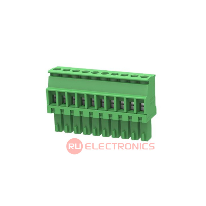 Шаг между контактами 3.5 мм, Тип разъема Клеммник на провод , Количество контактов 10 , Рабочий ток контактов 8 А, Рабочее напряжение между контактами 300 В, Сечение присоединяемых проводов, min 0.5 мм², Сечение присоединяемых проводов, max 1.5 мм², Способ фиксации провода Винт , Цвет корпуса Зеленый , Конструктивное исполнение Угловой , Направление ввода к плате 90° , Примечания Barrier Strip Terminal Block, 8A, 1.5mm2, 1 Row(s), 1 Deck(s)