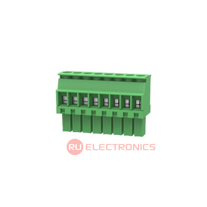 Шаг между контактами 3.5 мм, Тип разъема Клеммник на провод , Количество контактов 8 , Рабочий ток контактов 8 А, Рабочее напряжение между контактами 300 В, Сечение присоединяемых проводов, min 0.5 мм², Сечение присоединяемых проводов, max 1.5 мм², Способ фиксации провода Винт , Цвет корпуса Зеленый , Конструктивное исполнение Угловой , Направление ввода к плате 90°