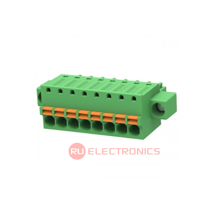 Шаг между контактами 3.5 мм, Тип разъема Клеммник на провод , Количество контактов 8 , Рабочий ток контактов 8 А, Рабочее напряжение между контактами 300 В, Сечение присоединяемых проводов, min 0.2 мм², Сечение присоединяемых проводов, max 1.5 мм², Способ фиксации провода Пружина , Цвет корпуса Зеленый , Конструктивное исполнение Прямой , Направление ввода к плате 180° , Примечания С фиксирующими винтами
