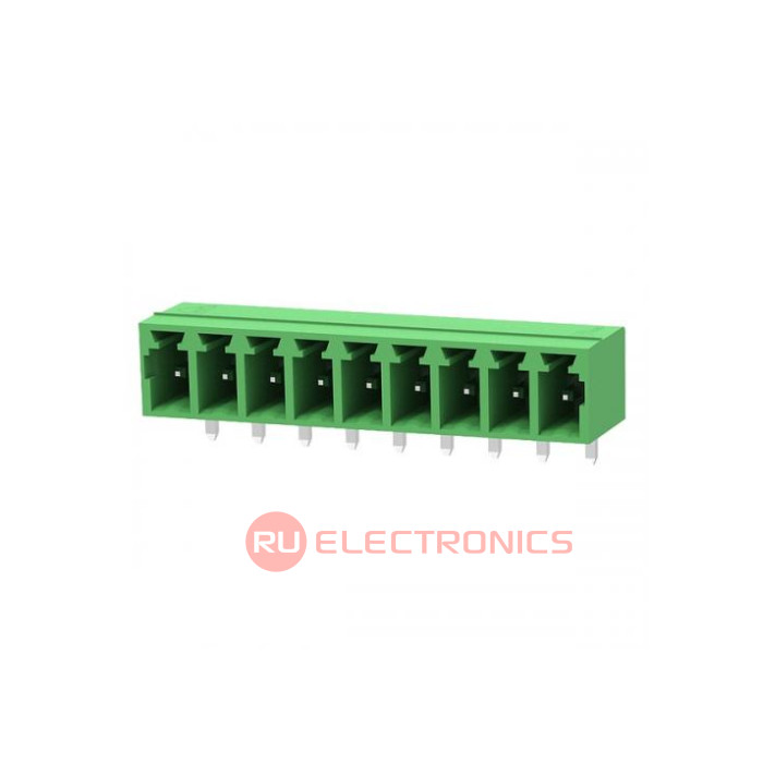 Шаг между контактами 3.81 мм, Тип разъема Клеммник на плату , Количество контактов 9 , Рабочий ток контактов 8 А, Рабочее напряжение между контактами 300 В, Способ фиксации провода нет , Цвет корпуса Зеленый , Конструктивное исполнение Угловой , Направление ввода к плате 180° , Примечания Barrier Strip Terminal Block, 8A, 1 Row(s), 1 Deck(s)
