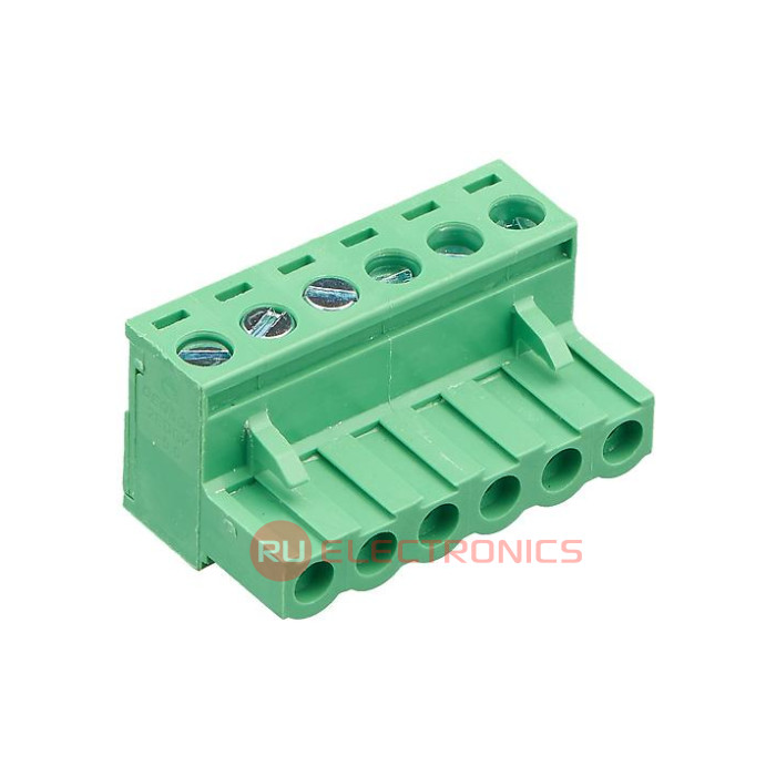Шаг между контактами 5 мм, Тип разъема Клеммник на провод , Количество контактов 6 , Рабочий ток контактов 15 А, Рабочее напряжение между контактами 300 В, Сечение присоединяемых проводов, min 0.2 мм², Сечение присоединяемых проводов, max 2.5 мм², Способ фиксации провода Винт , Цвет корпуса Зеленый , Конструктивное исполнение Прямой , Направление ввода к плате 180° , Примечания Barrier Strip Terminal Block, 15A, 2.5mm2, 1 Row(s), 1 Deck(s)