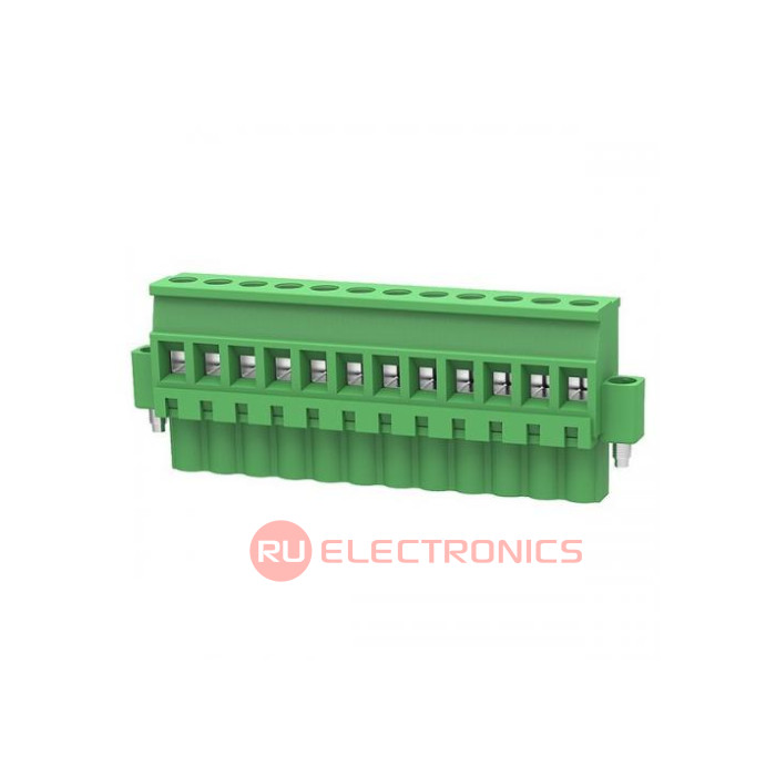 Шаг между контактами 5 мм, Тип разъема Клеммник на провод , Количество контактов 12 , Рабочий ток контактов 15 А, Рабочее напряжение между контактами 300 В, Сечение присоединяемых проводов, min 0.2 мм², Сечение присоединяемых проводов, max 2.5 мм², Способ фиксации провода Винт , Цвет корпуса Зеленый , Конструктивное исполнение Угловой , Направление ввода к плате 90° , Примечания С фиксирующими винтами