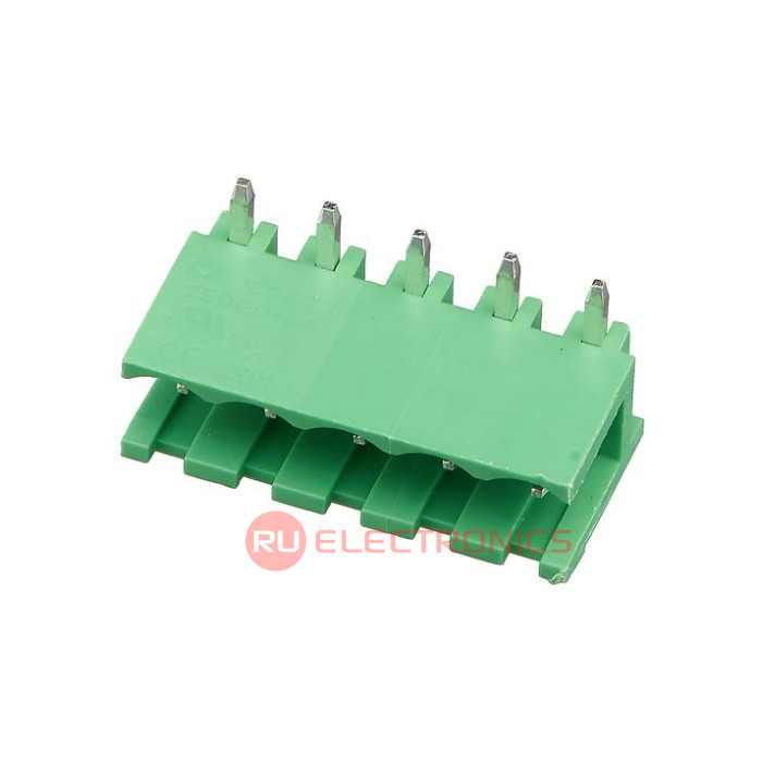 Шаг между контактами 5 мм, Тип разъема Клеммник на плату , Количество контактов 5 , Рабочий ток контактов 15 А, Рабочее напряжение между контактами 300 В, Способ фиксации провода нет , Цвет корпуса Зеленый , Конструктивное исполнение Угловой , Направление ввода к плате 180° , Примечания Strip Terminal Block, 15A, 1 Row(s), 1 Deck(s)