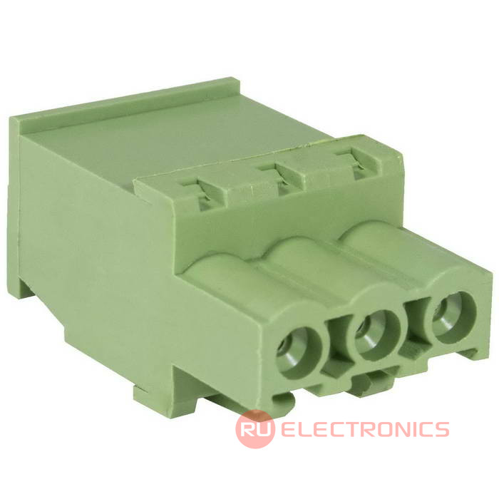 Клеммник разъемный угловой, розетка (F) SZC XY2500F-AV-03P (2EDKA-03), 3 контакта с шагом 5,0 мм, 12 А, 28-12 AWG, 2,5 мм?, PA66 – это конструкции, состоящие из 2-х частей. Одна из которых крепится на плате, а вторая – непсредственно на кабеле. Для соединения подвижная часть клеммника вставляется в неподвижную и фиксируется зажимной пластиной.