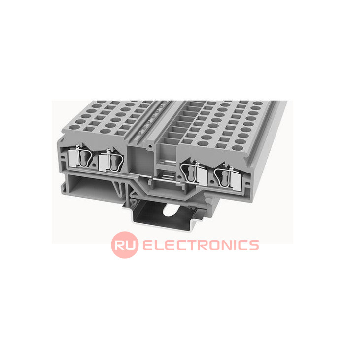 Тип пружинный зажим , Max. сечение провода 4 мм², Max. ток 32 A, Количество точек подключения проводов 2 , Цвет серый , Длина 86.2 мм, Ширина 33 мм, Высота 6 мм, Рабочая температура -40 °C, Рабочая температура 105 °C, Примечание Spring-cage type Din-Rail TB, connector method: Spring-cage/plug-in connector, Rated voltage: 800 V, Rated current: 32 A, Number of connectors: 4, Number of potentials: 1, Cross section: 0.2 mm² - 4 mm², AWG: 28 - 12, Width: 6 mm, Color: gray, Mounting type: NS 35/7.5, NS 35/15