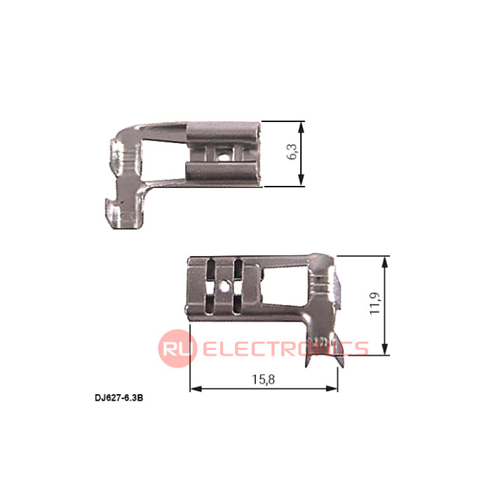 Клемма ножевая неизолированная F-типа угловая RUICHI DJ627-6.3B 6.3 мм, латунь предназначена для быстрого соединения проводников, клеммников и винтовых терминалов, а также для соединения кабелей одинаковых или разных разъёмов между собой. Такие клеммы для быстрого соединения служит для обеспечения разборного качественного контактного соединения проводников с различным сечением. Сами ножевые клеммы могут быть медными, бронзовыми или лужеными, а так же могут выпускаться с изоляционной манжетой или гильзой. Материал изоляции – самозатухающий поливинилхлорид (ПВХ). Возможные варианты цветности изоляционных гильз наконечников – красный, синий, желтый.