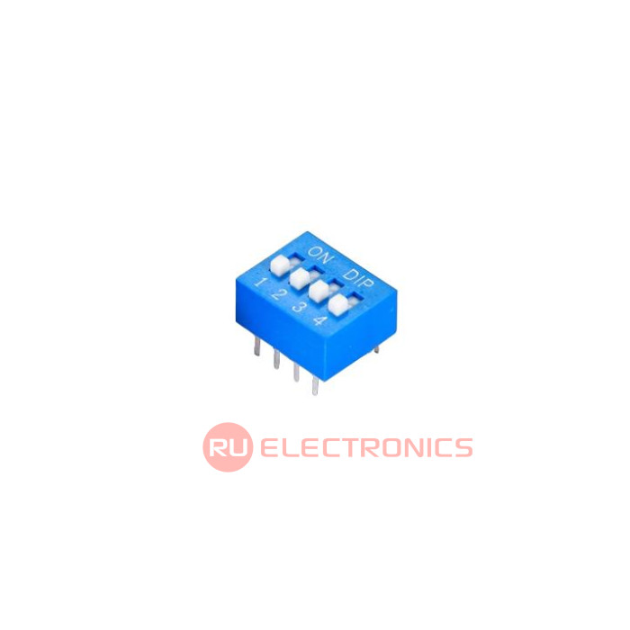 Переключатель KLS в монолитном корпусе DIP с верхним расположениями штока и контактами для вертикального монтажа через отверстия. Имеет 4 контактные движковые группы в виде набора однополюсных SPST-контактов. Шаг выводов: 2.54 мм; нагрузочная способность контактов: 25 мA; высота штока: 1.1 мм; количество циклов коммутации: 2000.