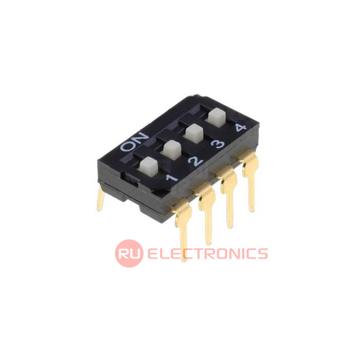 Тип компонента Переключатель , Тип переключателя DIP , Цепь переключателя SPST , Количество контактных групп 4 , Шаг выводов 2.54 , Стиль актуатора Slide , Нагрузочная способность контактов 0.025 A, Тип монтажа Сквозные отверстия