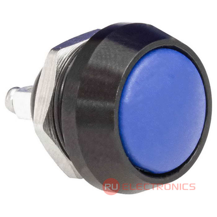 Кнопка антивандальная без подсветки RUICHI GQ12B-10/B/Bl/N, 1NO, ОFF-(ON) без фиксации, пос. диаметр 12 мм, контакты 2S, 2 А, 50 мОм, -20...+55 °C, корпус пластиковый черный, кнопка синяя