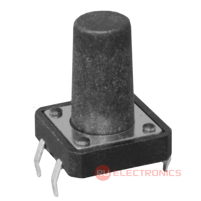 Тактовая кнопка RUICHI KAN1211-1501B, 12x12x15 мм, OFF-(ON), 50 мА, 12 В, 100 мОм – это разновидность простейших механических выключателей, обеспечивающая замыкание контактов (без фиксации) только при наличии давления на поверхность штока (толкателя).
