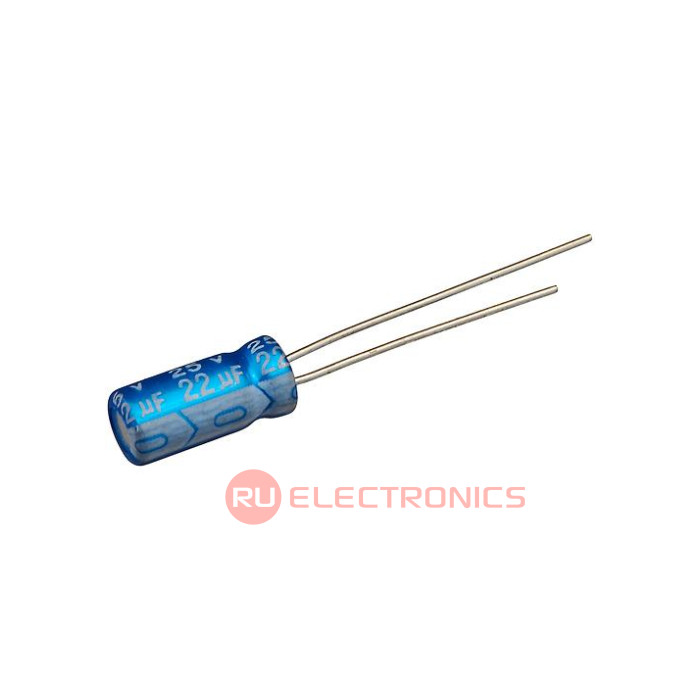 Ёмкость номинальная 22 мкФ, Допуск по ёмкости ±20% , Напряжение номинальное 25 В, Температура рабочая, min -40 °C, Температура рабочая, max 105 °C, Срок службы 2000 ч, Диаметр корпуса 5 мм, Высота корпуса 11 мм, Способ монтажа Radial , Шаг между выводами 2 мм