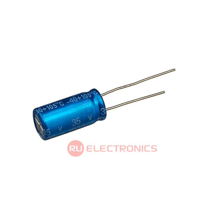 Ёмкость номинальная 1 000 мкФ, Допуск по ёмкости ±20% , Напряжение номинальное 35 В, Температура рабочая, min -40 °C, Температура рабочая, max 105 °C, Срок службы 2000 ч, Диаметр корпуса 10 мм, Высота корпуса 20 мм, Способ монтажа Radial , Шаг между выводами 5 мм