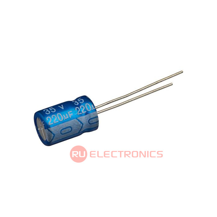 Ёмкость номинальная 220 мкФ, Допуск по ёмкости ±20% , Напряжение номинальное 35 В, Температура рабочая, min -40 °C, Температура рабочая, max 105 °C, Срок службы 2000 ч, Диаметр корпуса 8 мм, Высота корпуса 12 мм, Способ монтажа Radial , Шаг между выводами 3.5 мм