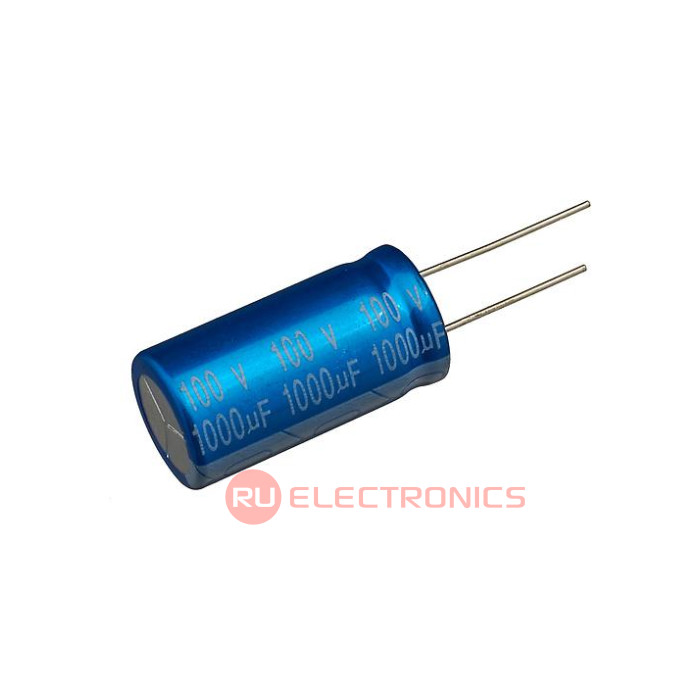 Конденсатор электролитический; 1000 мкФ; ±20%; 100 В; 2000 ч; -40…105 °C; Ø18х35 мм; радиальные выводы.