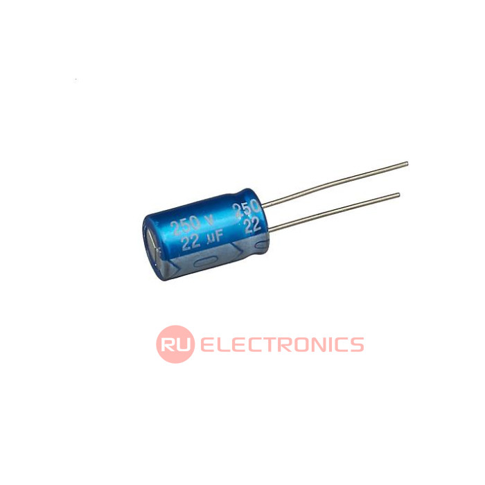 Ёмкость номинальная 22 мкФ, Допуск по ёмкости ±20% , Напряжение номинальное 250 В, Температура рабочая, min -25 °C, Температура рабочая, max 105 °C, Срок службы 2000 ч, Диаметр корпуса 10 мм, Высота корпуса 17 мм, Способ монтажа Radial , Шаг между выводами 5 мм, Длина 10 мм, Ширина 10 мм, Высота 17 мм, Примечание Aluminum Electrolytic Capacitor, Polarized, Aluminum (wet), 250V, 20% +Tol, 20% -Tol, 22uF, Through Hole Mount