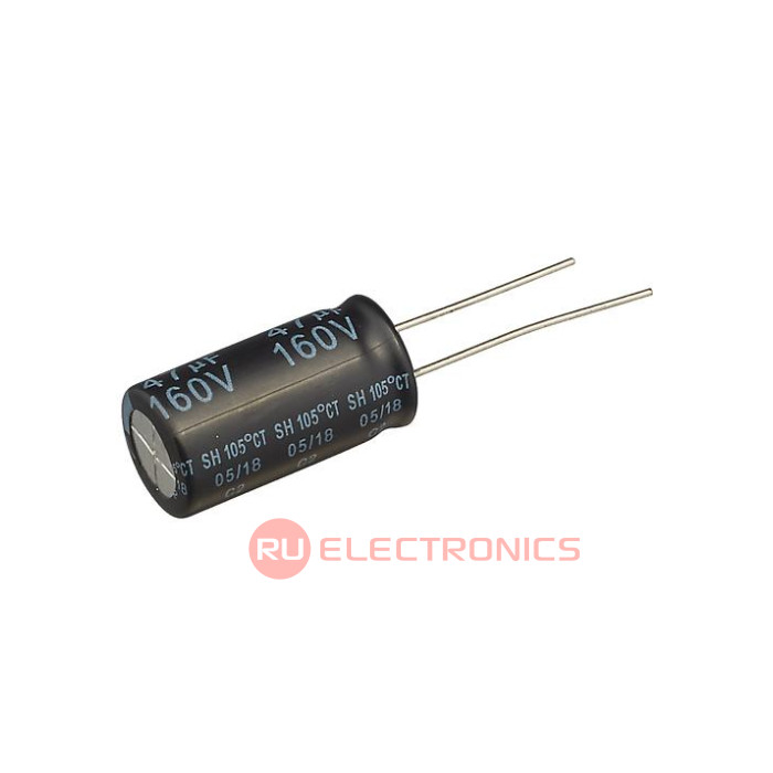 Ёмкость номинальная 47 мкФ, Допуск по ёмкости ±20% , Напряжение номинальное 160 В, Температура рабочая, min -40 °C, Температура рабочая, max 105 °C, Срок службы 2000 ч, Диаметр корпуса 13 мм, Высота корпуса 25 мм, Способ монтажа Radial , Шаг между выводами 5 мм, Длина 13 мм, Ширина 13 мм, Высота 27 мм, Примечание Rubber stand-off 2mm, for General