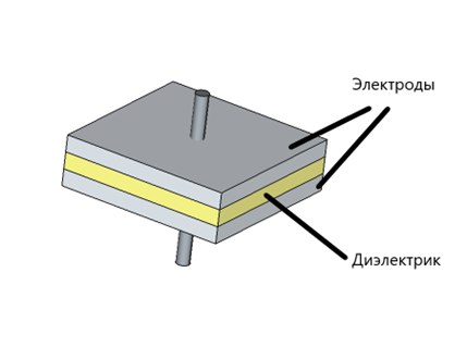 Простейшая структура конденсатора показана на рисунке 1. Энергия запасается в электромагнитном поле, которое создается между электродами (обкладками), между которыми расположен диэлектрик.