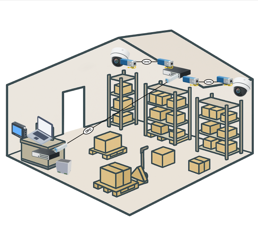 На складах и в логистических центрах сеть видеонаблюдения должна быть устойчива к нагрузкам и работать без сбоев при большом количестве подключённых камер. Здесь особенно важны стабильное питание, защита линий и качественная передача данных на больших расстояниях.