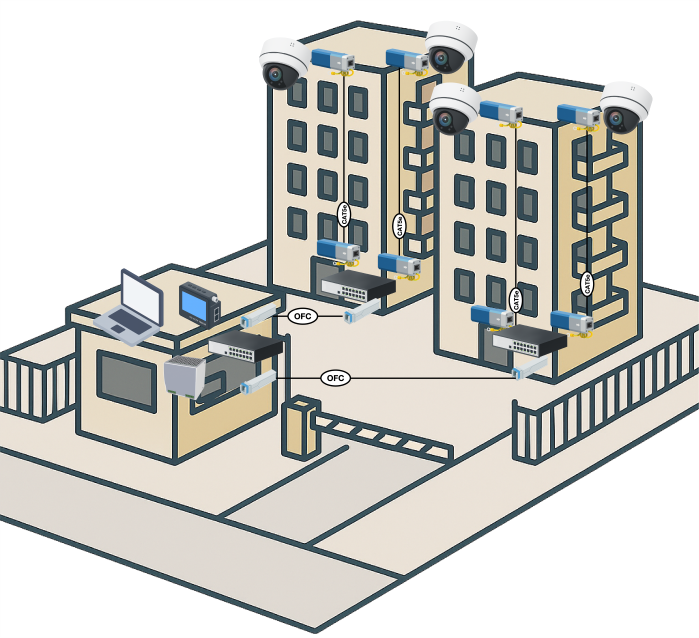 Для объединения распределённых узлов - например, камер на разных корпусах или подъездах - применяются SFP-модули RUICHI. Они передают данные по оптике на расстояние до 20 км, обеспечивая устойчивую связь между зданиями без влияния электромагнитных помех.