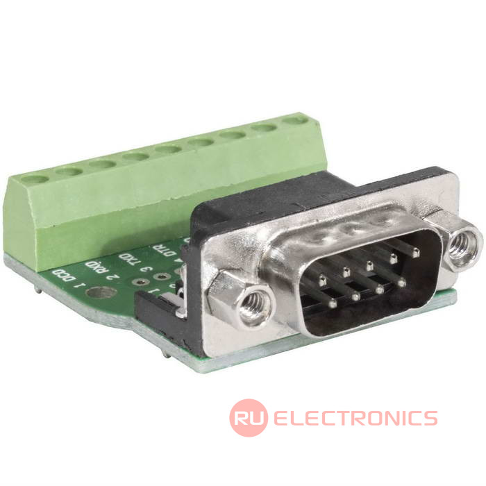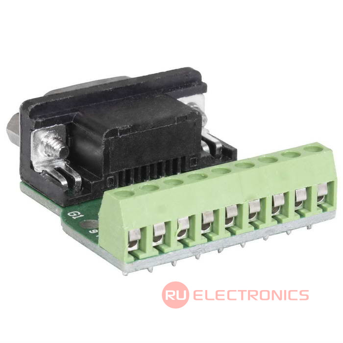 Электронный сигнальный модуль на плате адаптера DRB-09MB (вилка) RUICHI 903-3 для RS-232 интерфейса. Эта конфигурация используется чаще всего при подключении к какому-либо устройству с помощью ПК. Имеет выход нескольких проводов на винтовой клеммный блок. Шаг клемм 2.77 мм. Цвет: черный, зеленый.