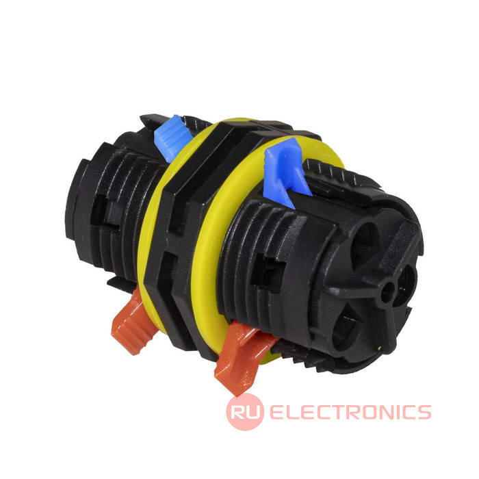Герметичный разъем RUICHI M20-2P-1, резьба М20, 2 контакта, пружинно-зажимной монтаж, IP68, 16 А, 250 В, корпус PA66 UL94-V2, черный является пылезащищенным и влагозащищенным. Герметичный разъем соответствует высокой степени защиты, что гарантирует работу разъемов при длительном погружении в воду (более 30 минут) на глубину больше 1 м.