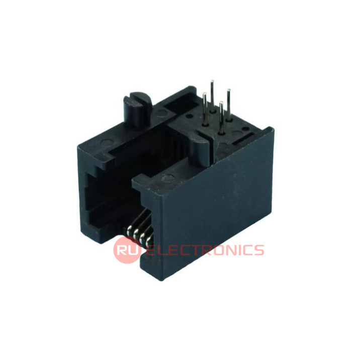 Тип соединителя Розетка , Количество портов разъема 1 , Количество позиций/контактов 6P4C , Монтаж Поверхностный , Расположение контактов Угловое , Примечания Telecom and Datacom Connector, 4 Contact(s), Female, Right Angle, Solder Terminal, Locking, Jack