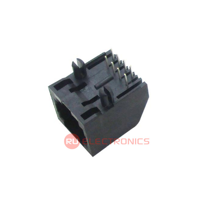 Тип соединителя Розетка , Конфигурация RJ45 , Количество портов разъема 1 , Количество позиций/контактов 8P8C , Монтаж Поверхностный , Расположение контактов Угловое , Примечания Modular Jack, Right PCB Mount, Unshield, 8P8C (RJ45), Without Panel, Black, Gold 1u.