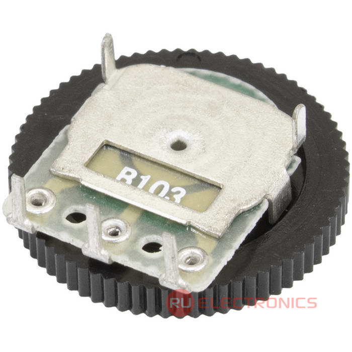 Дуплексный зубчатый потенциометр (переключатель громкости) RUICHI B103, 10 кОм, 1 А, 50 В/12 В, 3 контакта, корпус: толщина 2 мм, диаметр 16 мм используются при многократных регулировках аппаратуры, обладают большой износоустойчивостью.