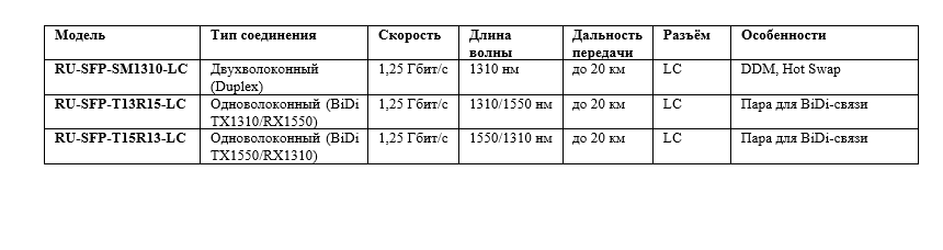 Таблица 3: Дальность связи и тип SFP-модулей RUICHI