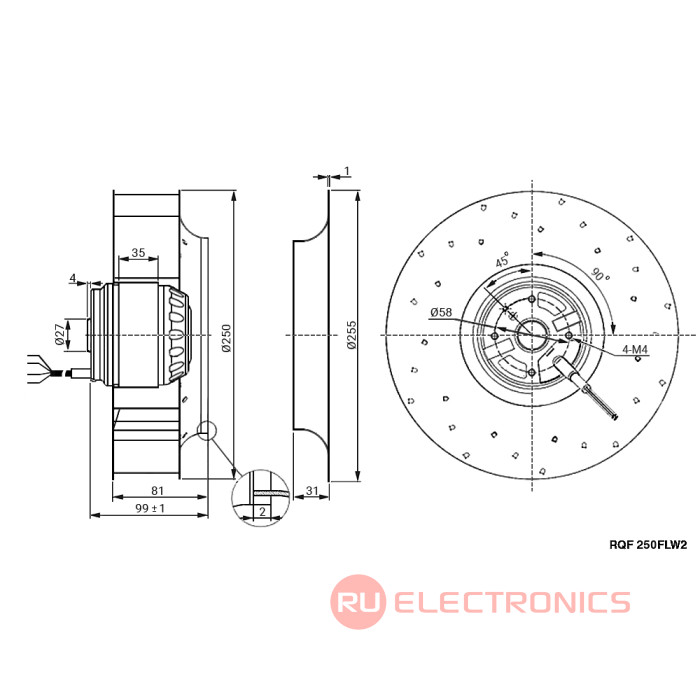 Вентилятор центробежный AC RUICHI RQF 250FLW2, 220В, 2600/2900 об/мин, 854/878 м3/ч, 150/210Вт