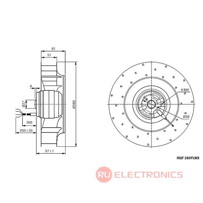 Вентилятор центробежный AC RUICHI RQF 280FLW2, 220В, 2550/2650 об/мин, 1148 м3/ч, 200/270Вт